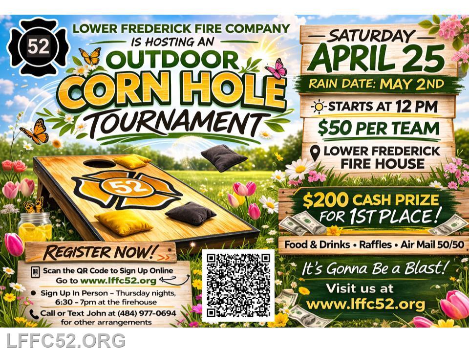 | Lower Frederick Fire Company is hosting a Spring Cornhole Tournament at 12pm on April 25, 2026 at 137 Spring Mount Rd., Schwenksville, PA 19473 (Rain Date May 2)